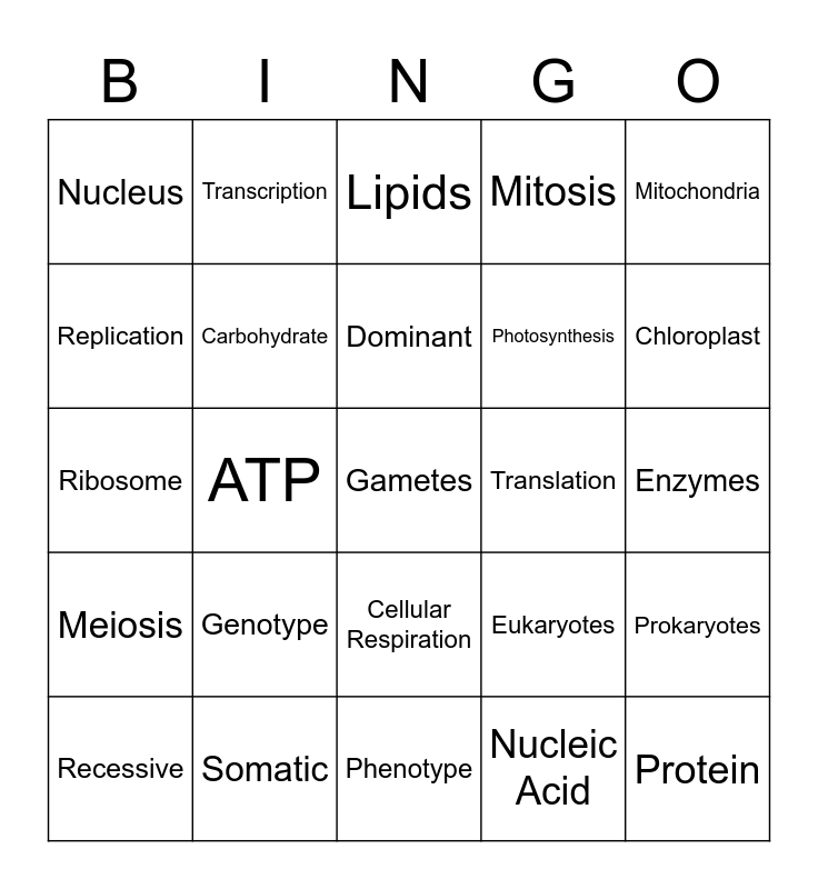 This bingo card has 25 words: Genotype, Phenotype, Dominant, Recessive, Mitochondria, Nucleus, Replication, Transcription, Translation, Cellular Respiration, Photosynthesis, Ribosome, Eukaryotes, Prokaryotes, Carbohydrate, Protein, Enzymes, Lipids, Chloroplast, ATP, Gametes, Somatic, Meiosis, Mitosis and Nucleic Acid.
