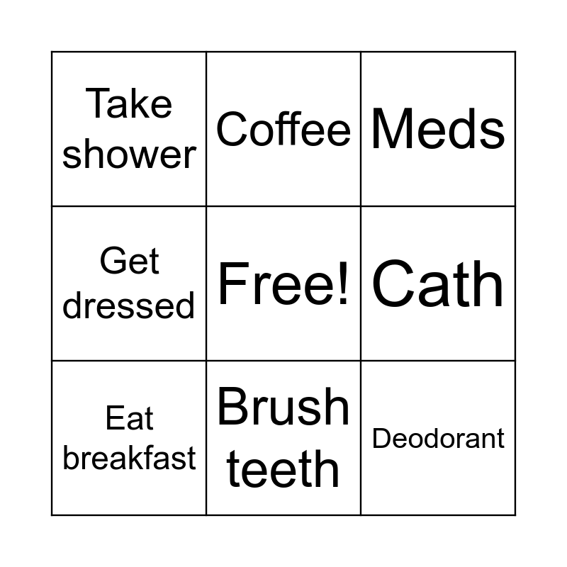This bingo card has a free space and 8 words: Cath, Meds, Coffee, Eat breakfast, Take shower, Deodorant, Get dressed and Brush teeth.