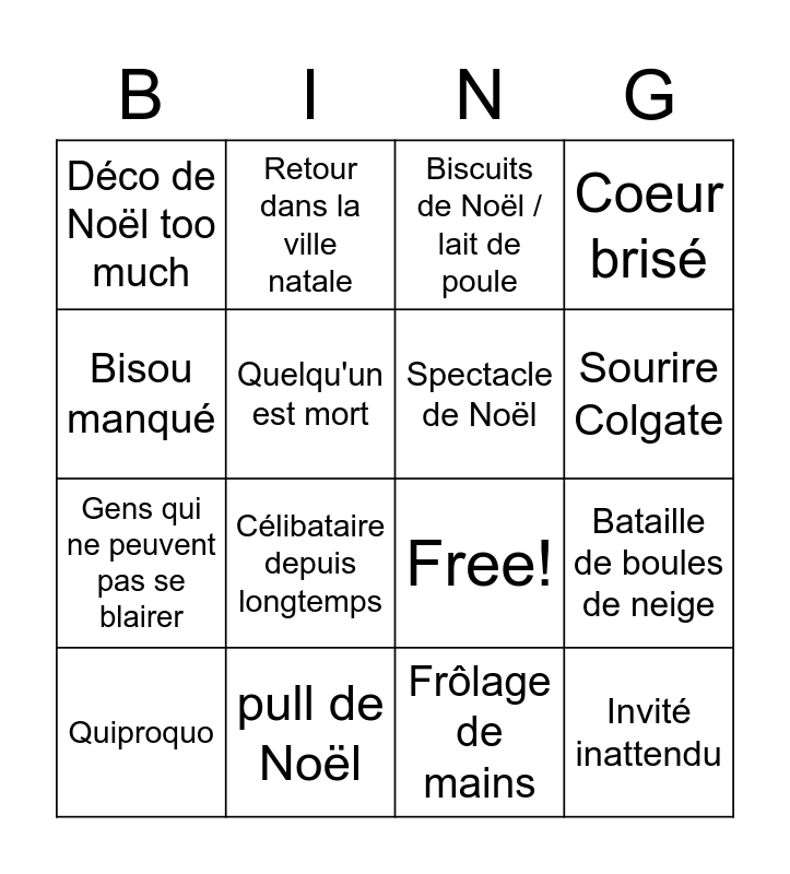 This bingo card has 22 words: pull de Noël, Perso magique, Retour dans la ville natale, Meilleure amie reloue, Quelqu'un est mort, Spectacle de Noël, Déco de Noël too much, Biscuits de Noël / lait de poule, Free!, Invité inattendu, Gens qui ne peuvent pas se blairer, Coeur brisé, Perso qui perd l'esprit de Noël, Il neige pour Noël, Frôlage de mains, Bénévolat, Bataille de boules de neige, Quiproquo, Célibataire depuis longtemps, Bisou manqué, Sourire Colgate and Transition de plans dégueulasse.