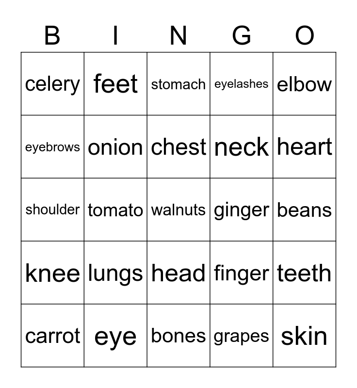 This bingo card has a free space and 29 words: carrot, brain, tomato, kidneys, celery, stomach, onion, lungs, ginger, eye, beans, skin, bones, grapes, heart, mouth, head, knee, elbow, shoulder, finger, arm, neck, eyebrows, eyelashes, feet, teeth, chest and tongue.