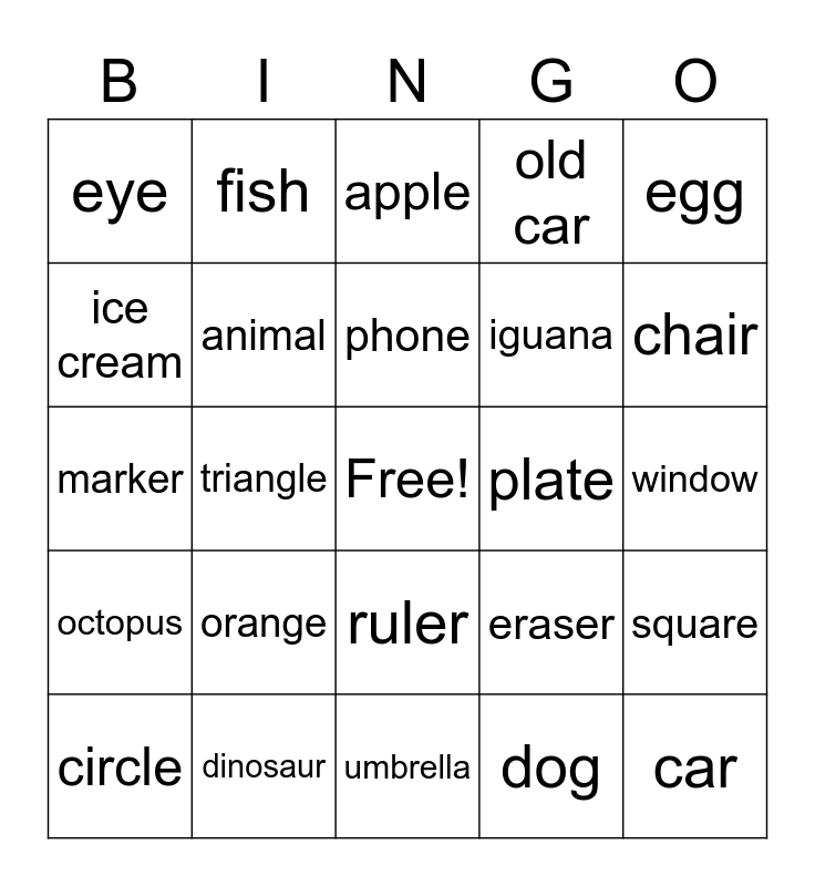 This bingo card has a free space and 29 words: monster, dinosaur, apple, bird, egg, eye, animal, phone, plate, square, circle, triangle, dog, car, marker, pencil, umbrella, eraser, chair, octopus, orange, oval, iguana, window, ice cream, fish, ruler, old car and baby.