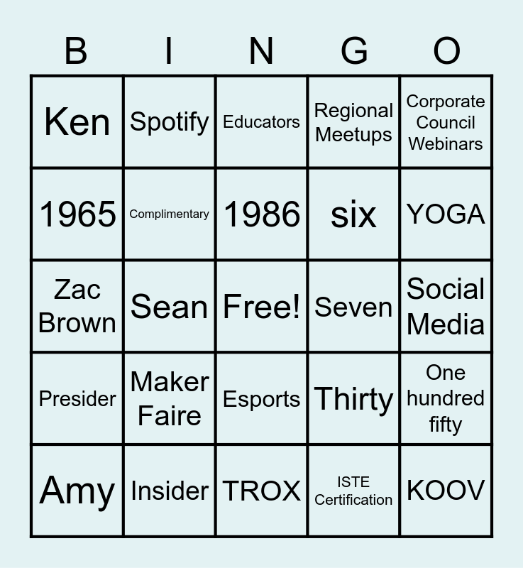 This bingo card has a free space and 44 words: Certification, KOOV, Makey-Makey, Amy, Forty, ISTE Certification, Educators, Parents, Corporate Council Webinars, Insider, Regional Meetups, Seven, Esports, Maker Faire, Microsoft, TROX, DELL, Zac Brown, Carl Hooker, YOGA, Spotify, Poster Sessions, Sian, Ken, Paige, Social Media, TED, Fab 5, Thirty, Presider, Corporate Focus Group, One hundred fifty, One hundred eighty, GAME, Sean, Amy S., Mary Beth, Sarah, 1986, 1965, six, DO Ed Tech, Complimentary and Eight.