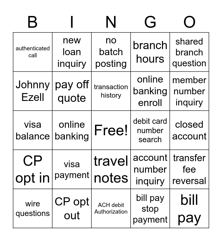 This bingo card has a free space and 77 words: Balance, over drawn account, no batch posting, password on account, member pass sign up, member pass authenticated, precise ID, Precise ID fail, Minor account, account opening questions, branch questions, check on hold, transaction history, Johnny Ezell, pay by phone, online banking, password reset, bill pay, funds transfer, shared branch question, statement copies, visa balance, pay off quote, new loan inquiry, branch hours, skip a pay, fraud dispute, non fraud dispute, ATM dispute, ACH dispute, ACH stop payment, Check Stop payment, routing number inquiry, account number inquiry, member number inquiry, online banking enroll, address change, lost debit card, closed account, bill pay stop payment, we connect case, pay off letter, member email, pay off call from dealership, online banking phone number change, precise blocked, wire questions, authenticated call, unauthenticated call, email ID and note (blocked precise), phone number update, travel notes, Debit Card limit increase, ATM limit increase, Credit Card increase, shared branch limit increase, shared branch finder, check hold release, debit card replacement, instant issue questions, visa payment, vehicle payment, LOC payment, debit card decline, falcon transfer, SSN search, member number search, debit card number search, social security payment inquiry, CP fee reversal, NSF fee reversal, transfer fee reversal, CP opt in, CP opt out, due date change, ACH debit Authorization and Loan Coupons.