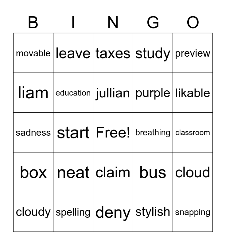 This bingo card has a free space and 44 words: boxing, snapping, children, cloudy, main, stylish, taxes, lonely, preview, spelling, study, breathing, claim, neat, restarted, deny, spinning, sadness, stay, likable, leave, worry, informal, movable, school, classroom, teacher, student, bus, box, snap, cloud, tax, spell, start, spin, like, form, jullian, liam, purple, hershey, education and center.