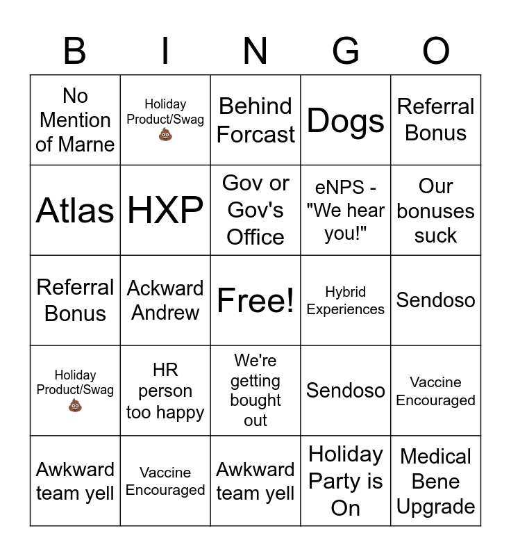 This bingo card has a free space and 47 words: eNPS - "We hear you!", Medical Bene Upgrade, Our bonuses suck, Awkward team yell, HR person too happy, We're getting bought out, Holiday Product/Swag 💩, Hermes, Atlas, Athena, HXP, Dogs, Vaccine Encouraged, Sendoso, Lazers, Logistic Delays, Gov or Gov's Office, Hybrid Experiences, Behind Forcast, Referral Bonus, Ackward Andrew, Holiday Party is On, No Mention of Marne, eNPS - "We hear you!", Medical Bene Upgrade, Our bonuses suck, Awkward team yell, HR person too happy, We're getting bought out, Holiday Product/Swag 💩, Hermes, Atlas, Athena, HXP, Dogs, Vaccine Encouraged, Sendoso, Lazers, Logistic Delays, Gov or Gov's Office, Hybrid Experiences, Behind Forcast, Referral Bonus, Ackward Andrew, Holiday Party is On, No Mention of Marne and Cringe presenter.