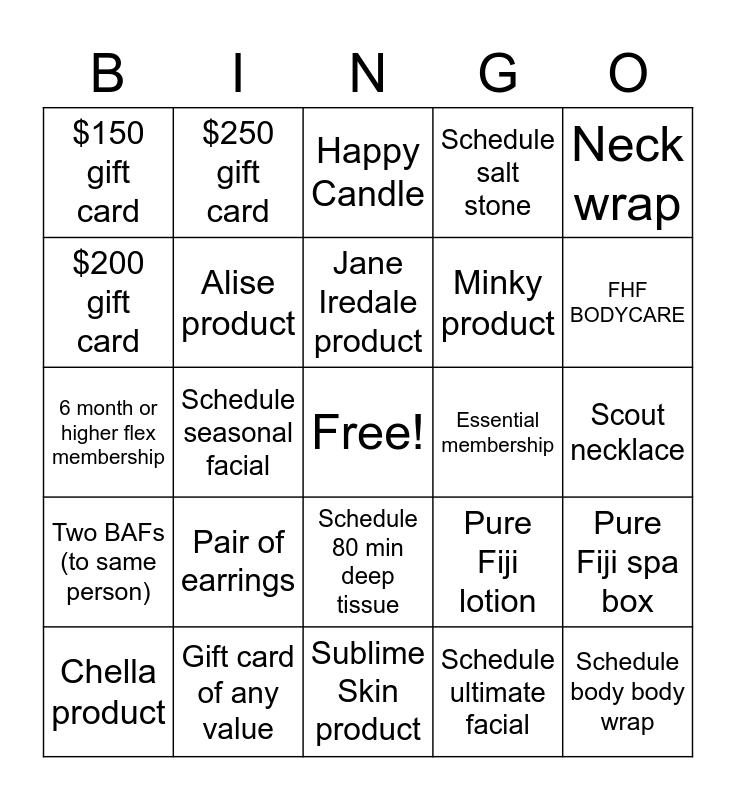 This bingo card has a free space and 25 words: Pair of earrings, Sublime Skin product, Jane Iredale product, Chella product, Neck wrap, $150 gift card, $200 gift card, $250 gift card, Essential membership, Schedule 80 min deep tissue, Minky product, 6 month or higher flex membership, Pure Fiji lotion, Pure Fiji spa box, Alise product, Scout bracelet, Scout necklace, Happy Candle, FHF BODYCARE, Schedule seasonal facial, Schedule body body wrap, Gift card of any value, Two BAFs (to same person), Schedule salt stone and Schedule ultimate facial.