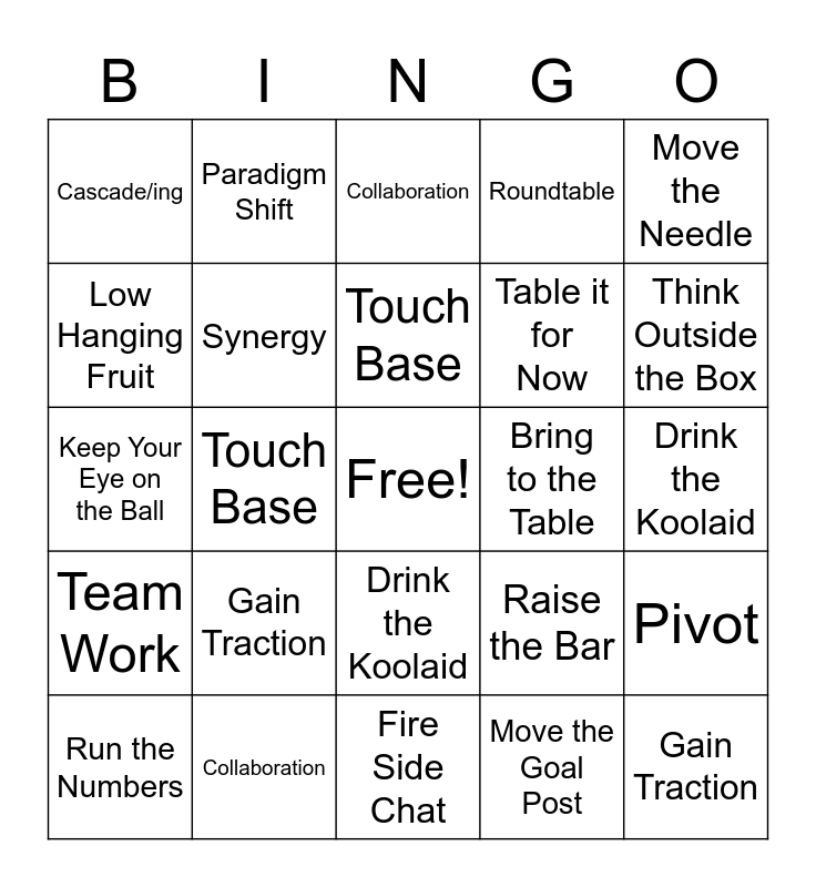 This bingo card has a free space and 24 words: Gain Traction, Collaboration, Touch Base, Run the Numbers, Move the Needle, Cascade/ing, Low Hanging Fruit, Paradigm Shift, Bring to the Table, Drink the Koolaid, Table it for Now, Keep Your Eye on the Ball, Raise the Bar, Pivot, Synergy, Move the Goal Post, Drink the Koolaid, Collaboration, Think Outside the Box, Touch Base, Gain Traction, Team Work, Roundtable and Fire Side Chat.