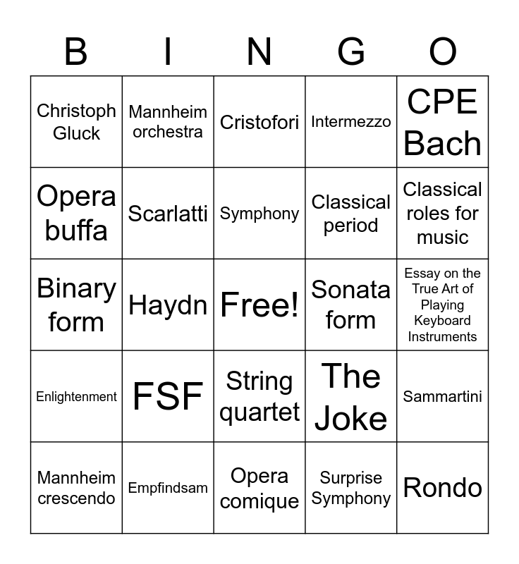 This bingo card has a free space and 32 words: Surprise Symphony, Esterhazy, Haydn, The Joke, Enlightenment, Scarlatti, CPE Bach, Sammartini, Mannheim orchestra, Stamitz, Symphony, Cristofori, Singspiel, Opera reform, Sonata form, Binary form, Mannheim crescendo, Binary form, String quartet, FSF, The Joke, Sonata in D Major, Essay on the True Art of Playing Keyboard Instruments, Empfindsam, Rondo, Intermezzo, Classical period, Opera buffa, Christoph Gluck, Opera comique, Classical music values and Classical roles for music.