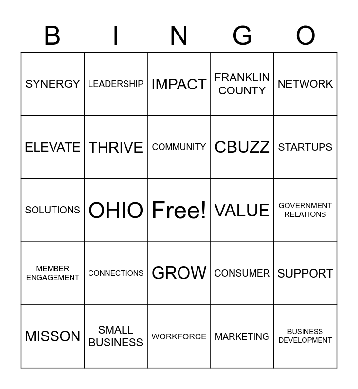 This bingo card has a free space and 30 words: SMALL BUSINESS, COLUMBUS, OHIO, BUCKEYES, SYNERGY, IMPACT, THRIVE, GROW, VALUE, WORKFORCE, GOVERNMENT RELATIONS, BUSINESS DEVELOPMENT, MARKETING, VISABILITY, STARTUPS, MOVE THE NEEDLE, CONSUMER, MEMBER ENGAGEMENT, CONNECTIONS, NETWORK, SOLUTIONS, INDUSTRY, LEADERSHIP, CBUZZ, ELEVATE, FRANKLIN COUNTY, SUPPORT, MISSON, COMMUNITY and ENGAGEMENT.