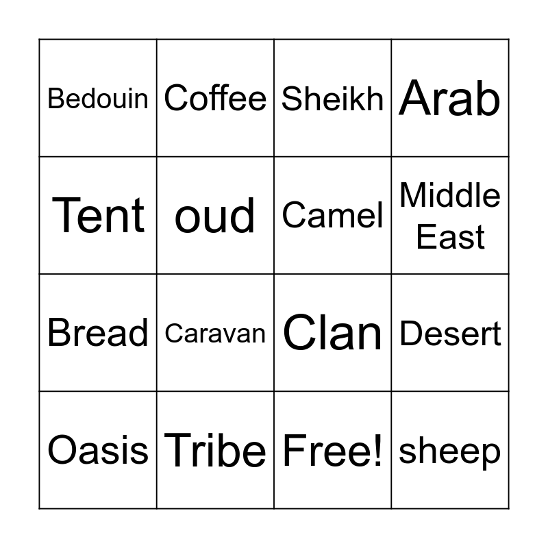 This bingo card has 17 words: Free!, Oasis, Sheikh, Bedouin, Caravan, Arab, Desert, Camel, Middle East, oud, Tribe, Clan, Tent, Coffee, Bread, herder and sheep.