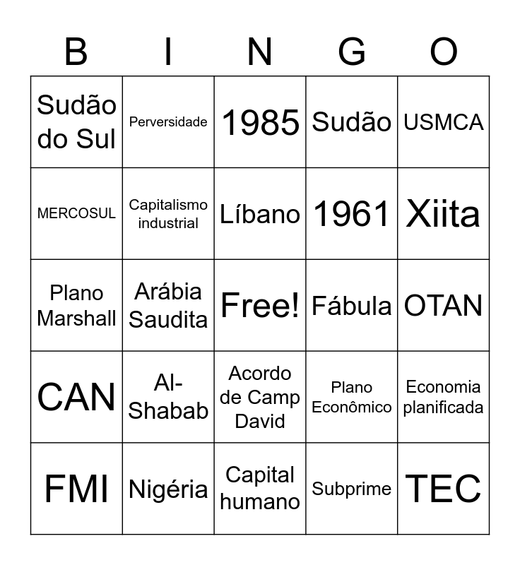 This bingo card has a free space and 24 words: Al-Shabab, Nigéria, Líbano, FMI, USMCA, Sudão do Sul, MERCOSUL, Perversidade, Fábula, Acordo de Camp David, 1961, Plano Marshall, Plano Econômico, Economia planificada, Capitalismo industrial, Subprime, OTAN, 1985, Xiita, Arábia Saudita, TEC, CAN, Sudão and Capital humano.