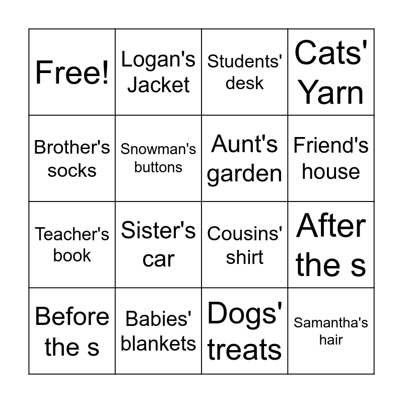 This bingo card has 16 words: Before the s, Babies' blankets, Students' desk, Cats' Yarn, Brother's socks, Logan's Jacket, Cousins' shirt, After the s, Free!, Snowman's buttons, Dogs' treats, Friend's house, Teacher's book, Sister's car, Aunt's garden and Samantha's hair.