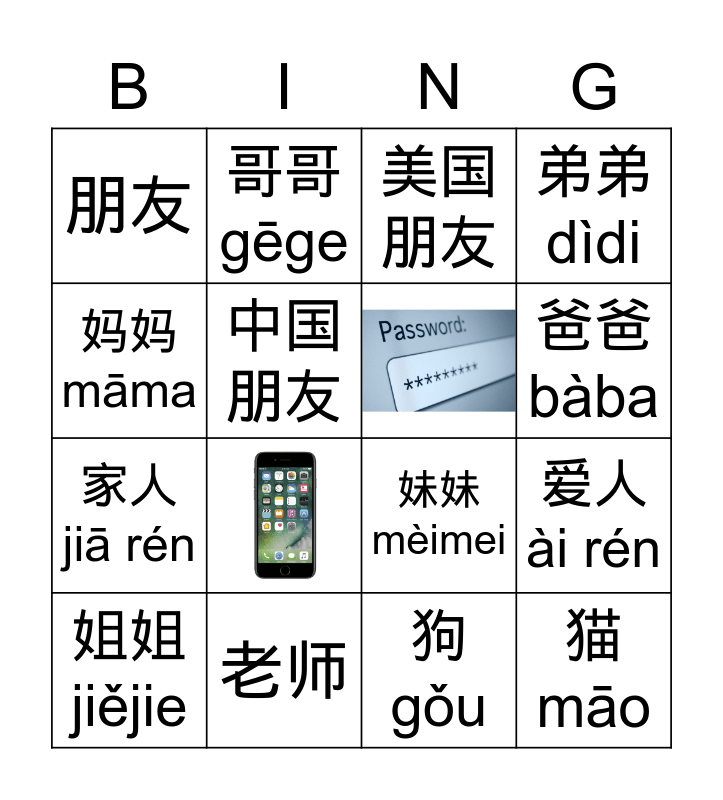 This bingo card has 3 images and 14 words: 姐姐 jiějie, 老师, 美国 朋友, 弟弟 dìdi, 家人 jiā rén, 中国 朋友, 妹妹 mèimei, 爸爸bàba, 妈妈 māma, 狗 gǒu, 爱人 ài rén, 朋友, 哥哥 gēge and 猫 māo.