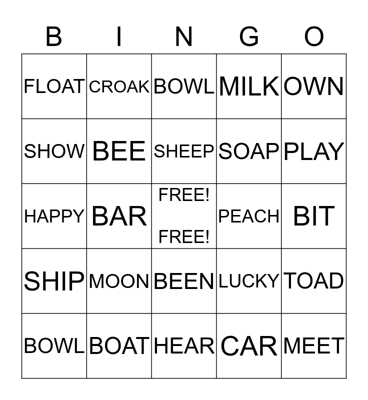 This bingo card has a free space and 24 words: MOON, BOAT, SHEEP, BOWL, OWN, FLOAT, SHOW, CROAK, PEACH, BEEN, SOAP, HAPPY, LUCKY, TOAD, BEE, CAR, BIT, BOWL, PLAY, BAR, MEET, SHIP, MILK and HEAR.