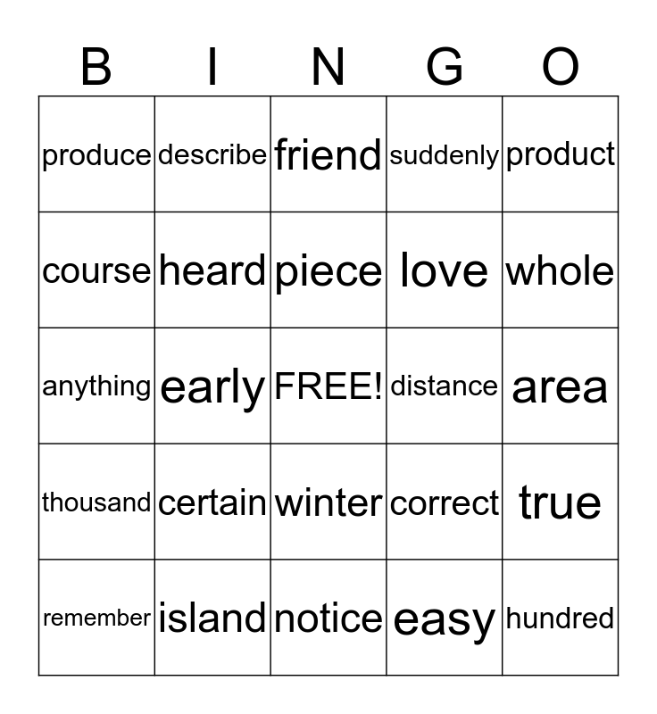 This bingo card has a free space and 24 words: certain, island, piece, remember, product, produce, course, describe, distance, winter, love, anything, correct, true, heard, easy, area, friend, whole, early, hundred, thousand, suddenly and notice.