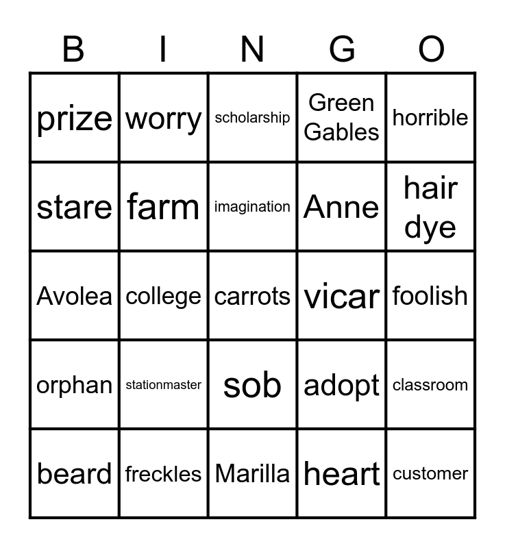 This bingo card has 30 words: freckles, rude, college, forgive, prize, scholarship, farm, sob, vicar, Marilla, foolish, carrots, heart, customer, hair dye, glasses, adopt, orphan, stationmaster, horrible, Avolea, branch, worry, Anne, stare, Green Gables, classroom, beard, imagination and medicine.