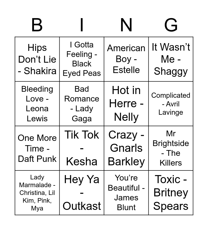 This bingo card has 21 words: Hey Ya - Outkast, Low - Flo Rida, I Gotta Feeling - Black Eyed Peas, Skinny Love - Bon Iver, You’re Beautiful - James Blunt, Hot in Herre - Nelly, Hips Don’t Lie - Shakira, American Boy - Estelle, Crazy - Gnarls Barkley, Complicated - Avril Lavinge, One More Time - Daft Punk, It Wasn’t Me - Shaggy, Toxic - Britney Spears, I Bet That You Look Good On The Dance Floor, Bad Romance - Lady Gaga, Yeah - Usher, Lady Marmalade - Christina, Lil Kim, Pink, Mya, Tik Tok - Kesha, Bleeding Love - Leona Lewis, Mr Brightside - The Killers and Feel Good - Gorillaz.