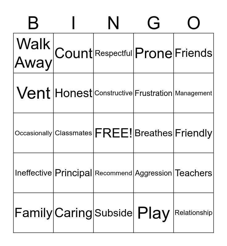 This bingo card has a free space and 24 words: Principal, Caring, Constructive, Family, Friends, Walk Away, Vent, Count, Breathes, Recommend, Frustration, Occasionally, Aggression, Teachers, Honest, Play, Friendly, Respectful, Management, Classmates, Relationship, Ineffective, Prone and Subside.