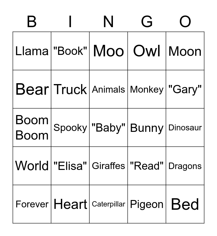 This bingo card has 25 words: "Elisa", Caterpillar, Animals, Forever, Moon, Llama, Bear, "Book", Bunny, Giraffes, Monkey, Boom Boom, "Read", Dragons, Truck, Bed, Dinosaur, Moo, "Gary", Spooky, "Baby", Heart, World, Owl and Pigeon.