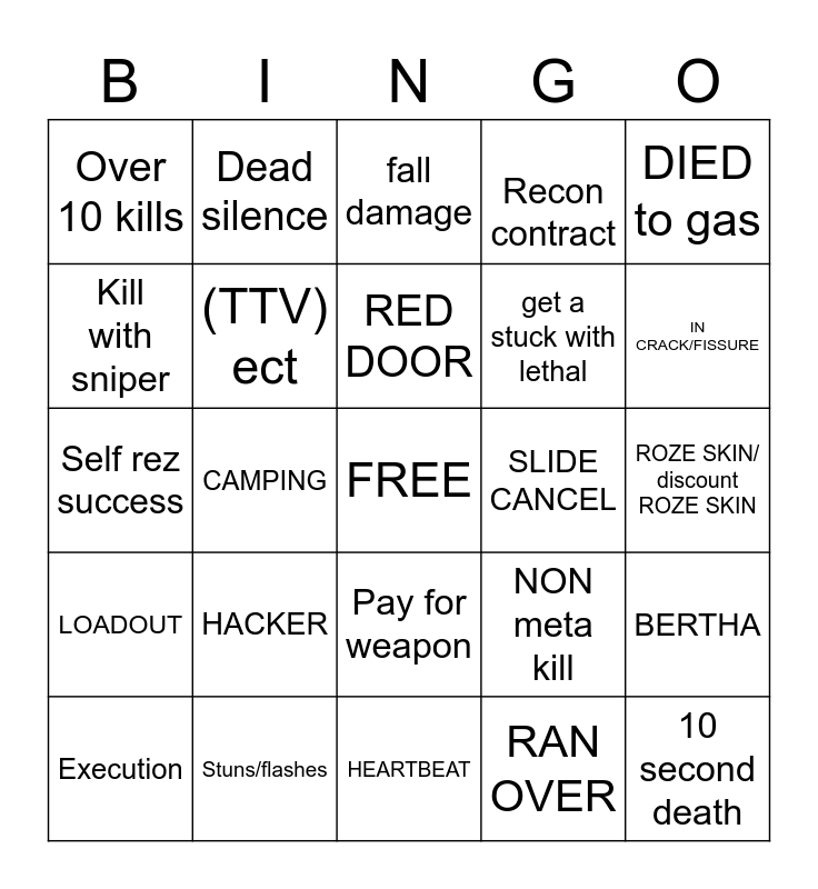 This bingo card has a free space and 24 words: HACKER, Stuns/flashes, RED DOOR, Execution, DIED to gas, Over 10 kills, Kill with sniper, Dead silence, SLIDE CANCEL, Pay for weapon, get a stuck with lethal, Self rez success, NON meta kill, BERTHA, (TTV) ect, RAN OVER, ROZE SKIN/ discount ROZE SKIN, fall damage, IN CRACK/FISSURE, CAMPING, 10 second death, LOADOUT, Recon contract and HEARTBEAT.