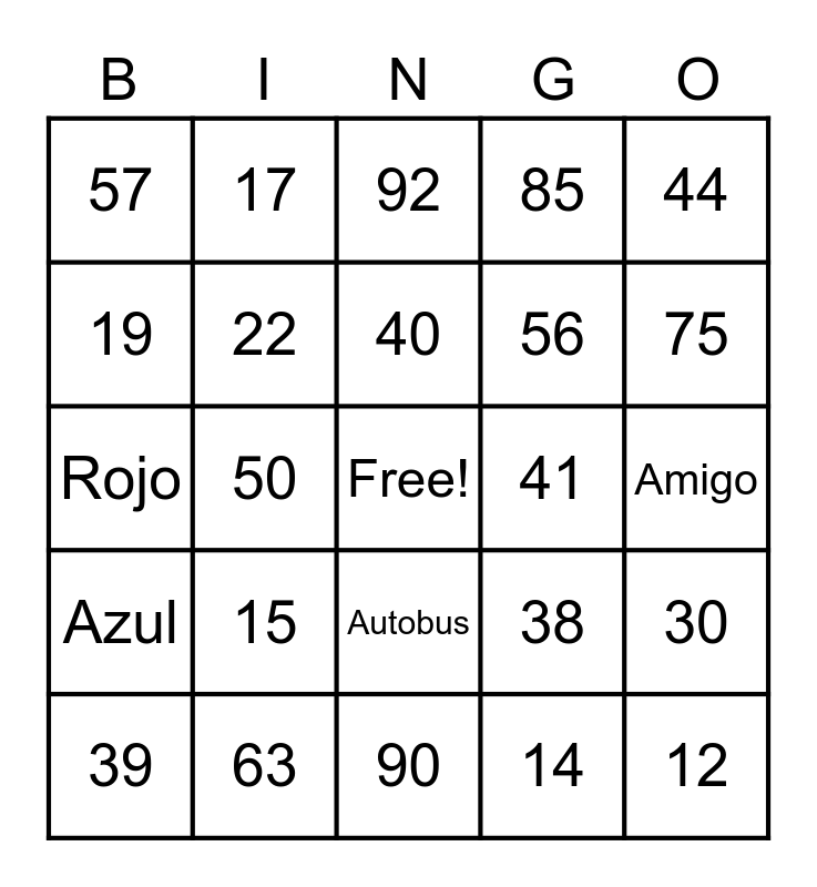This bingo card has a free space and 53 words: 11, 12, 13, 14, 15, 16, 17, 18, 19, 20, 22, 25, 30, 38, 31, 39, 40, 41, 42, 44, 50, 55, 56, 57, 60, 63, 70, 71, 73, 75, 77, 78, 80, 81, 82, 84, 85, 90, 92, 99, 100, Casa, Amigo, Amigas, Escuela, Autobus, Cabeza, Vivir, Rojo, Azul, Abrigo, Perro and Gato.