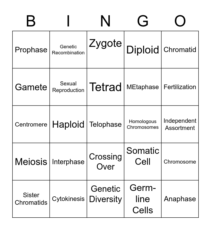 This bingo card has 25 words: Interphase, Genetic Diversity, Tetrad, Sister Chromatids, Chromatid, Prophase, Gamete, Genetic Recombination, Homologous Chromosomes, Crossing Over, MEtaphase, Centromere, Somatic Cell, Chromosome, Sexual Reproduction, Anaphase, Independent Assortment, Zygote, Fertilization, Haploid, Telophase, Cytokinesis, Meiosis, Diploid and Germ-line Cells.