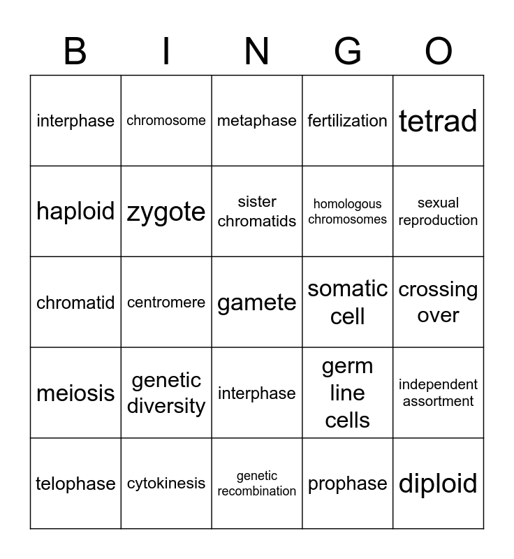 This bingo card has a free space and 24 words: genetic diversity, cytokinesis, sister chromatids, telophase, tetrad, interphase, haploid, chromosome, somatic cell, interphase, homologous chromosomes, chromatid, germ line cells, independent assortment, zygote, prophase, crossing over, metaphase, sexual reproduction, centromere, diploid, meiosis, fertilization and genetic recombination.