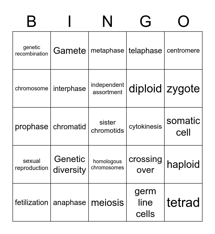 This bingo card has 25 words: Genetic diversity, meiosis, independent assortment, fetilization, centromere, genetic recombination, chromosome, Gamete, cytokinesis, homologous chromosomes, diploid, prophase, crossing over, haploid, interphase, tetrad, somatic cell, metaphase, zygote, chromatid, sister chromotids, anaphase, sexual reproduction, telaphase and germ line cells.