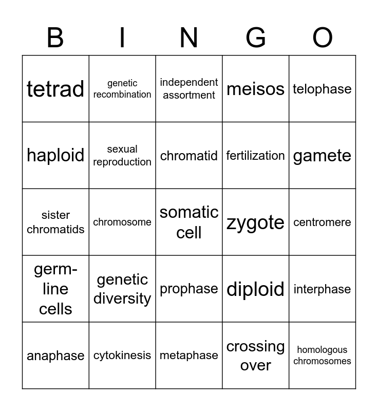 This bingo card has 25 words: genetic diversity, metaphase, chromatid, anaphase, telophase, tetrad, haploid, genetic recombination, zygote, prophase, fertilization, sister chromatids, diploid, interphase, sexual reproduction, homologous chromosomes, centromere, independent assortment, gamete, chromosome, somatic cell, cytokinesis, germ-line cells, meisos and crossing over.
