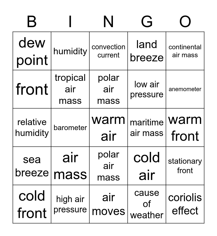 This bingo card has a free space and 24 words: air mass, high air pressure, polar air mass, cold front, continental air mass, dew point, front, humidity, maritime air mass, polar air mass, low air pressure, relative humidity, cold air, stationary front, tropical air mass, cause of weather, warm front, convection current, anemometer, barometer, coriolis effect, sea breeze, land breeze and air moves.