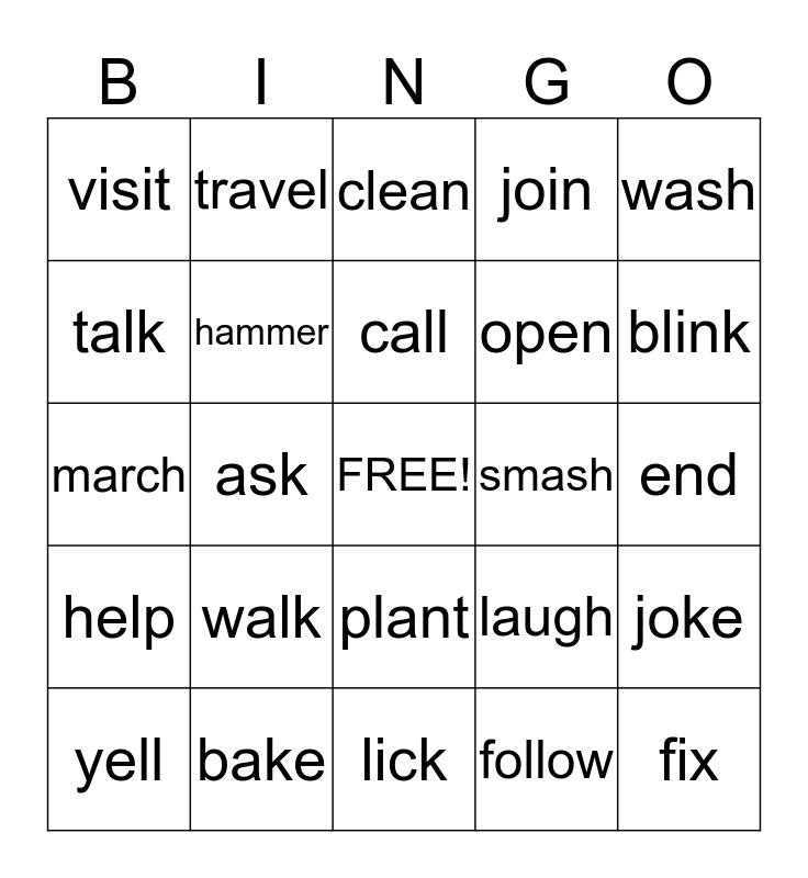 This bingo card has a free space and 24 words: walk, bake, call, yell, wash, visit, talk, travel, smash, plant, open, march, laugh, joke, hammer, follow, end, clean, blink, ask, fix, help, join and lick.