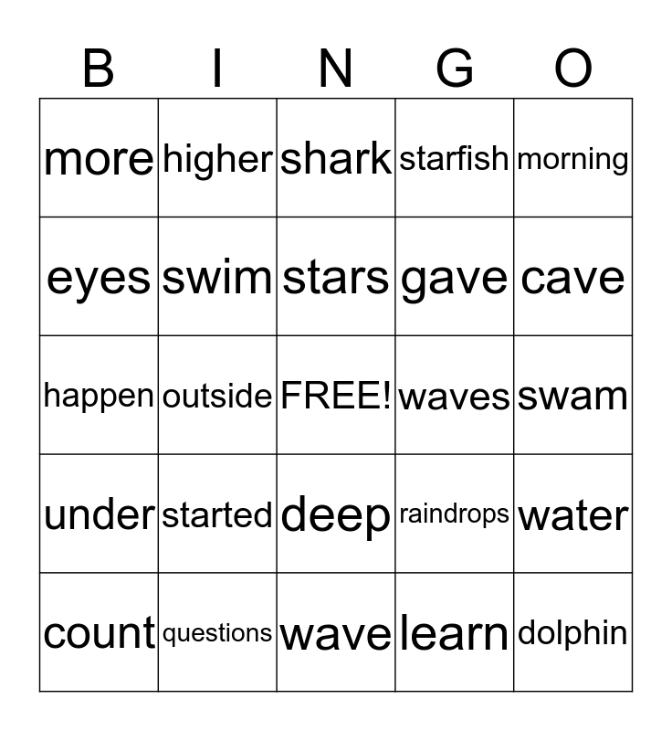 This bingo card has a free space and 24 words: started, questions, stars, count, morning, more, eyes, higher, waves, deep, gave, happen, raindrops, water, swim, learn, swam, shark, cave, outside, dolphin, under, starfish and wave.