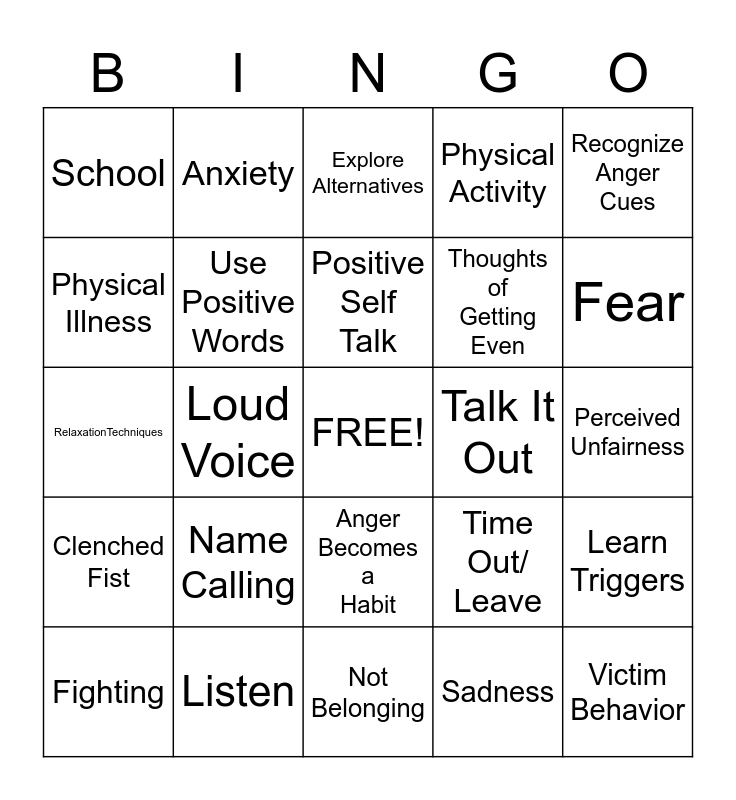 This bingo card has a free space and 24 words: Fighting, Name Calling, Positive Self Talk, Sadness, Recognize Anger Cues, School, Anxiety, Explore Alternatives, Talk It Out, Perceived Unfairness, RelaxationTechniques, Use Positive Words, Time Out/ Leave, Learn Triggers, Physical Illness, Listen, Not Belonging, Physical Activity, Fear, Clenched Fist, Loud Voice, Anger Becomes a Habit, Thoughts of Getting Even and Victim Behavior.