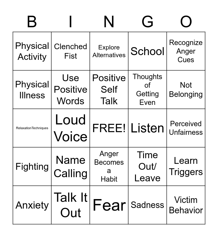 This bingo card has a free space and 24 words: Anxiety, Name Calling, Positive Self Talk, Sadness, Recognize Anger Cues, Physical Activity, Clenched Fist, Explore Alternatives, Listen, Perceived Unfairness, RelaxationTechniques, Use Positive Words, Time Out/ Leave, Learn Triggers, Physical Illness, Talk It Out, Fear, School, Not Belonging, Fighting, Loud Voice, Anger Becomes a Habit, Thoughts of Getting Even and Victim Behavior.