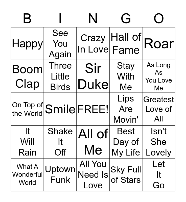 This bingo card has a free space and 24 words: Shake It Off, Uptown Funk, Sir Duke, What A Wonderful World, Roar, Happy, Boom Clap, See You Again, Lips Are Movin', All of Me, Stay With Me, On Top of the World, Best Day of My Life, Isn't She Lovely, Three Little Birds, Sky Full of Stars, Greatest Love of All, Crazy In Love, As Long As You Love Me, Smile, Let It Go, It Will Rain, Hall of Fame and All You Need Is Love.