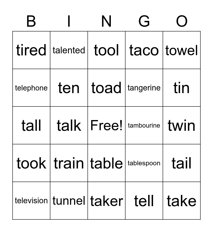 This bingo card has a free space and 24 words: train, tunnel, toad, television, towel, tired, telephone, talented, tambourine, table, tangerine, tall, tablespoon, tail, ten, tell, twin, tool, tin, talk, take, took, taco and taker.