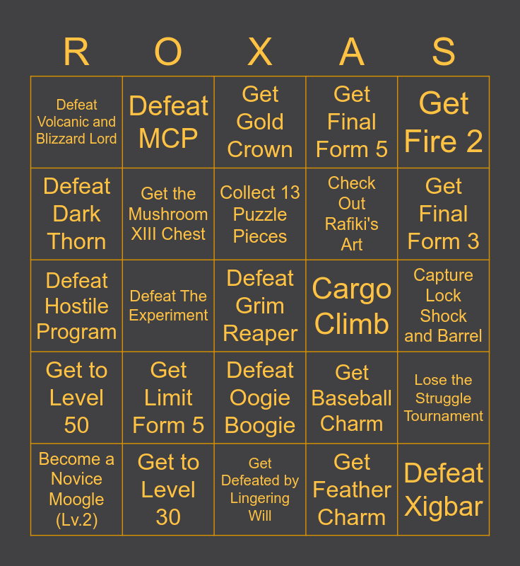 This bingo card has 1 images and 104 words: Get Cure 2, Get Cure 3, Get Fire 2, Get Fire 3, Get Blizzard 2, Get Blizzard 3, Get Reflect 2, Get Reflect 3, Get Magnet 2, Get Magnet 3, Get 3 Ansem Reports, Get 5 Ansem Reports, Get 7 Ansem Reports, Get Bronze Crown, Get Silver Crown, Get Gold Crown, Get 3 Torn Pages, Get Valor Form 3, Get Valor Form 5, Get Wisdom Form 3, Get Wisdom Form 5, Get Master Form 3, Get Master Form 5, Get Limit Form 3, Get Limit Form 5, Get Final Form 3, Get Final Form 5, Get 3 Orichalcum+, Get Lamp Charm, Get Baseball Charm, Get Feather Charm, Get Ukelele Charm, Get Olympus Stone, Get a Membership Card, Get a Money Pouch, Get No Experience, Get 13 Keyblades, Collect 13 Puzzle Pieces, Get to Level 30, Get to Level 40, Get to Level 50, Defeat Possessor (Door), Defeat Dark Thorn, Defeat Prison Keeper, Defeat Volcanic and Blizzard Lord, Defeat Storm Rider, Defeat Grim Reaper, Defeat Ground Shaker, Defeat Xigbar, Defeat Xaldin, Defeat Saix, Defeat Axel in STT, Defeat Demyx, Defeat Luxord, Defeat Roxas, Defeat Twilight Thorn, Defeat Cerberus, Defeat Genie Jafar, Defeat Oogie Boogie, Capture Lock Shock and Barrel, Defeat Beast, Defeat Hydra, Defeat Pete in the Past, Defeat Captain Barbossa, Chase Down Shenzi, Defeat Scar, Defeat MCP, Defeat Hostile Program, Defeat The Experiment, Get Defeated by Lingering Will, Win the Struggle Tournament, Defeat 1000 Heartless, Save Timon and Pumba, Defeat Hades, Visit Starry Hill, Defeat Xemnas 1, Grab Tifa's Chest, Become a Novice Moogle (Lv.2), Grab Gull Wing's Chest, Play Light Cycle Minigame, Complete one Atlantica musical, Play a Mushroom XIII minigame, Get the Mushroom XIII Chest, Deliver the Mail as Sora, Cargo Climb, Score 25 Points in Grandstander, Complete Poster Duty, Complete Bumble Buster, Complete Junk Sweep, Trigger Anti-Form, Complete any Skateboard Minigame, Acquire 11,000 or more munny, Acquire EXACTLY 420 munny, Lose the Struggle Tournament, Spin Timeless Pete, Do Any 3 Jobs As Sora, Equip Struggle Bat (You can do this now), Check Out Rafiki's Art, Buy something from the Peddler in Agrabah, Examine The Dart Board, Escort Abu Across The Street, Pegasus Neighs at You, Check Yourself out and Check Your Old Trophies.