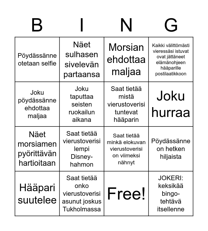 This bingo card has 17 words: Free!, Hääpari suutelee, Morsian ehdottaa maljaa, Pöydässänne otetaan selfie, Saat tietää vierustoverisi lempi Disney-hahmon, Kaikki välittömästi vieressäsi istuvat ovat jättäneet elämänohjeen hääparille postilaatikkoon, Pöydässänne on hetken hiljaista, Saat tietää mistä vierustoverisi tuntevat hääparin, Joku hurraa, Joku taputtaa seisten ruokailun aikana, Saat tietää onko vierustoverisi asunut joskus Tukholmassa, Saat tietää minkä elokuvan vierustoverisi on viimeksi nähnyt, Joku pöydässänne ehdottaa maljaa, Näet sulhasen sivelevän partaansa, Näet morsiamen pyörittävän hartioitaan, Kuulet tai näet jotakin yllättävää and JOKERI: keksikää bingo-tehtävä itsellenne.