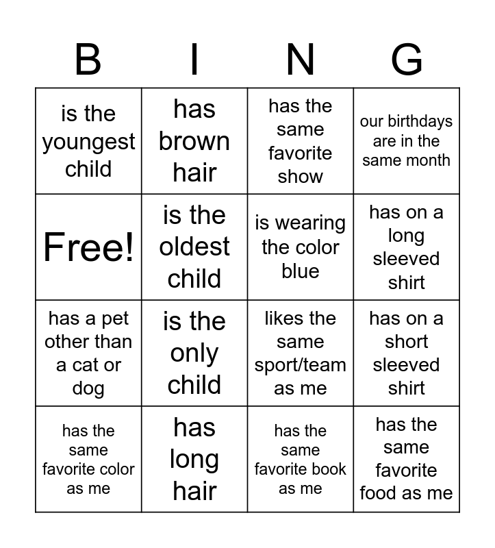 This bingo card has 16 words: has long hair, has on a short sleeved shirt, has the same favorite show, is the youngest child, has a pet other than a cat or dog, has brown hair, likes the same sport/team as me, has the same favorite book as me, Free!, is the oldest child, has the same favorite color as me, our birthdays are in the same month, is the only child, has on a long sleeved shirt, is wearing the color blue and has the same favorite food as me.