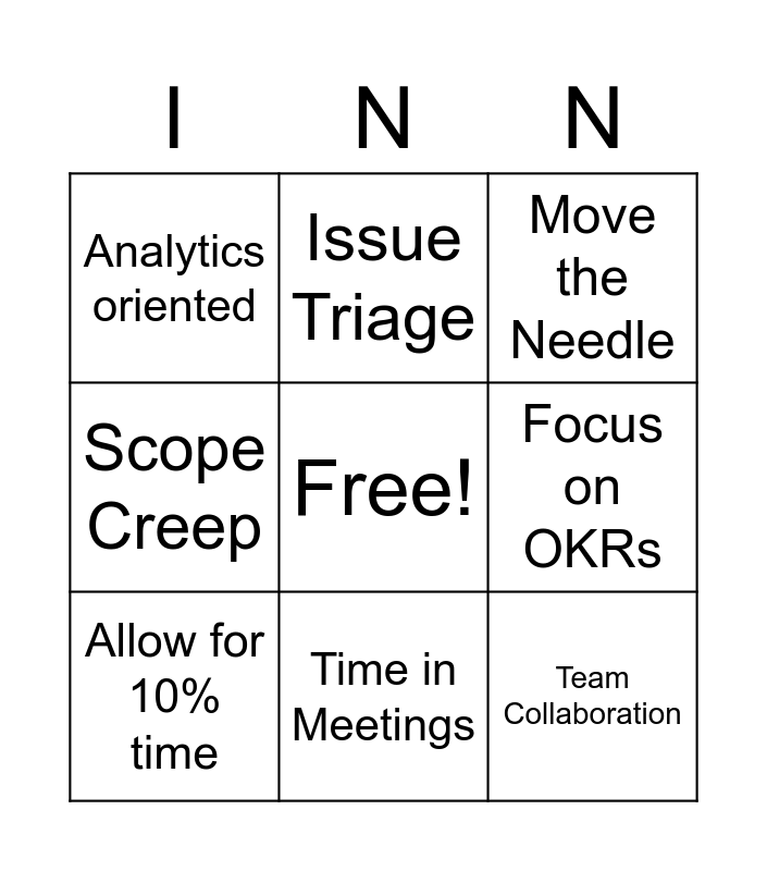 This bingo card has a free space and 8 words: Focus on OKRs, Move the Needle, Issue Triage, Allow for 10% time, Analytics oriented, Team Collaboration, Scope Creep and Time in Meetings.
