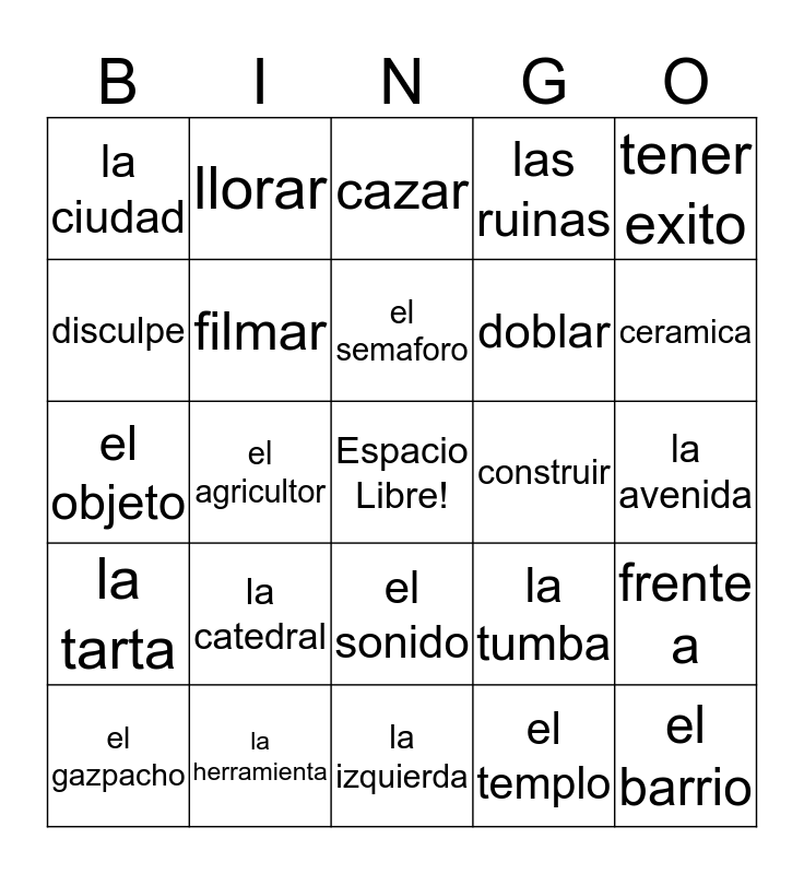 This bingo card has a free space and 24 words: la catedral, la herramienta, el semaforo, el gazpacho, tener exito, la ciudad, disculpe, llorar, construir, el sonido, doblar, el objeto, la tumba, frente a, filmar, el templo, la avenida, cazar, ceramica, el agricultor, el barrio, la tarta, las ruinas and la izquierda.