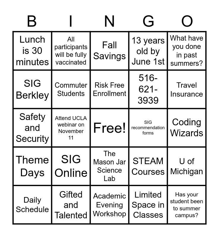 This bingo card has a free space and 24 words: SIG Online, Gifted and Talented, Risk Free Enrollment, Daily Schedule, What have you done in past summers?, Lunch is 30 minutes, SIG Berkley, All participants will be fully vaccinated, SIG recommendation forms, The Mason Jar Science Lab, 516-621-3939, Safety and Security, STEAM Courses, U of Michigan, Commuter Students, Limited Space in Classes, Coding Wizards, Fall Savings, Travel Insurance, Attend UCLA webinar on November 11, Has your student been to summer campus?, Theme Days, 13 years old by June 1st and Academic Evening Workshop.