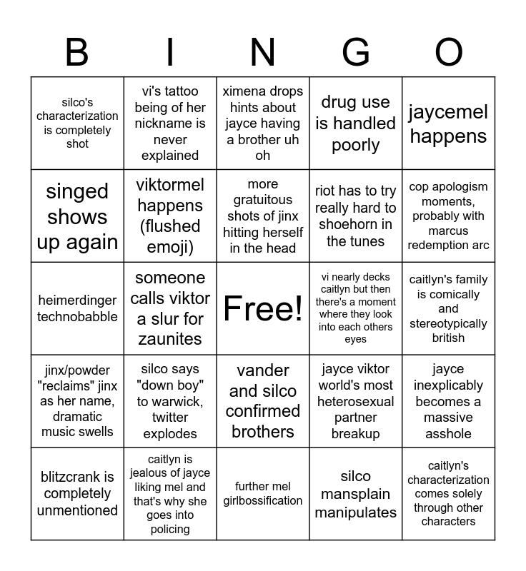 This bingo card has a free space and 24 words: silco says "down boy" to warwick, twitter explodes, caitlyn is jealous of jayce liking mel and that's why she goes into policing, more gratuitous shots of jinx hitting herself in the head, blitzcrank is completely unmentioned, jaycemel happens, silco's characterization is completely shot, singed shows up again, vi's tattoo being of her nickname is never explained, vi nearly decks caitlyn but then there's a moment where they look into each others eyes, vander and silco confirmed brothers, riot has to try really hard to shoehorn in the tunes, heimerdinger technobabble, jayce viktor world's most heterosexual partner breakup, jayce inexplicably becomes a massive asshole, viktormel happens (flushed emoji), silco mansplain manipulates, caitlyn's family is comically and stereotypically british, ximena drops hints about jayce having a brother uh oh, cop apologism moments, probably with marcus redemption arc, someone calls viktor a slur for zaunites, caitlyn's characterization comes solely through other characters, jinx/powder "reclaims" jinx as her name, dramatic music swells, drug use is handled poorly and further mel girlbossification.