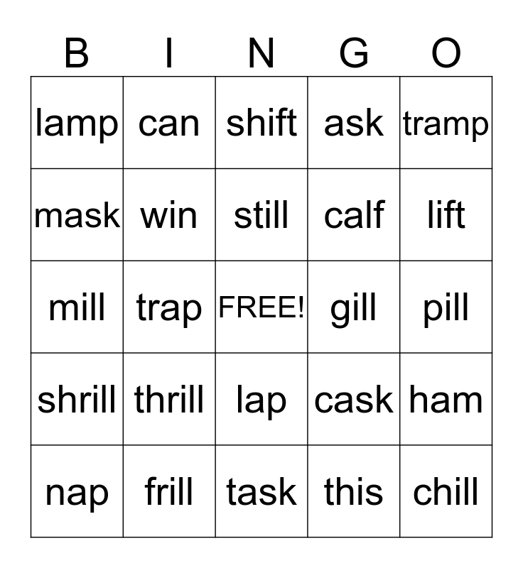 This bingo card has a free space and 24 words: thrill, frill, still, nap, tramp, lamp, mask, can, gill, lap, calf, mill, cask, ham, win, this, pill, shift, lift, trap, chill, shrill, ask and task.