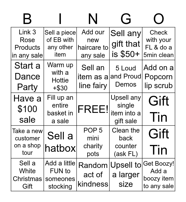 This bingo card has a free space and 24 words: Sell a hatbox, Add a little FUN to someones stocking, Sell an item as a line fairy, Sell a White Christmas Gift, Check with your FL & do a 5min clean, Link 3 Rose Products in any sale, Start a Dance Party, Sell a piece of EB with any other item, Upsell any single item into a gift sale, POP 5 mini charity pots, 5 Loud and Proud Demos, Have a $100 sale, Clean the back counter (ask FL), Gift Tin, Warm up with a Hottie +$30, Upsell to a larger size, Gift Tin, Add our new haircare to any sale, Add on a Popcorn lip scrub, Fill up an entire basket in a sale, Get Boozy! Add a boozy item to any sale, Take a new customer on a shop tour, Sell any gift that is $50+ and Random act of kindness.