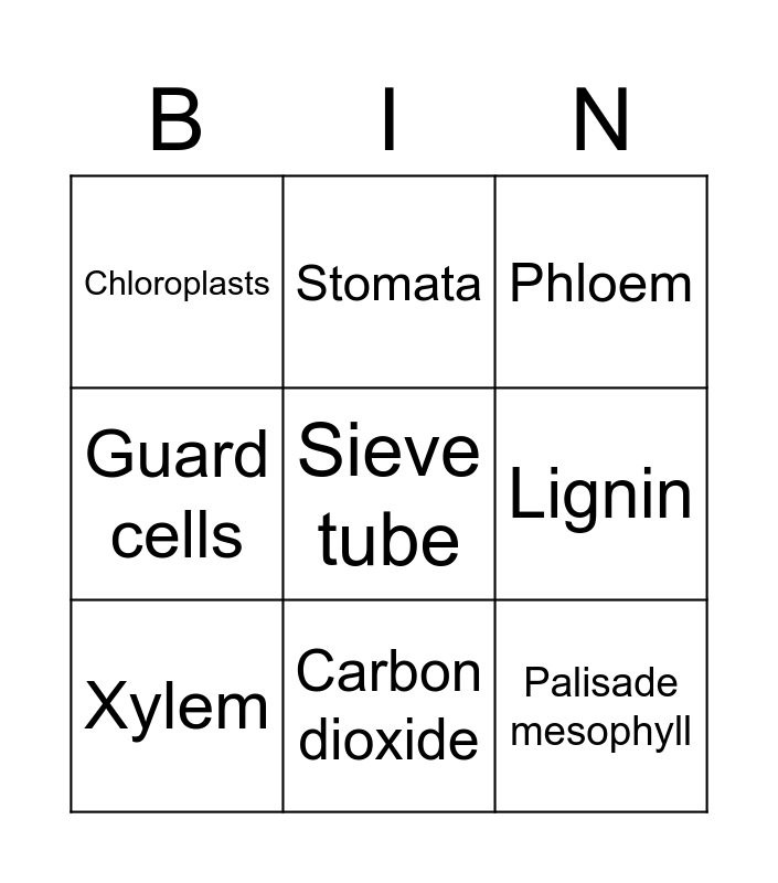 This bingo card has 9 words: Xylem, Phloem, Stomata, Guard cells, Chloroplasts, Lignin, Sieve tube, Palisade mesophyll and Carbon dioxide.