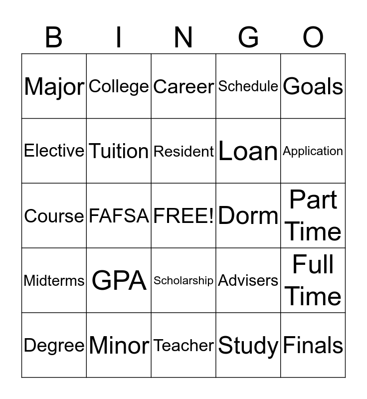 This bingo card has a free space and 24 words: GPA, Minor, Resident, Degree, Goals, Major, Elective, College, Dorm, Scholarship, Loan, Course, Advisers, Full Time, Tuition, Study, Part Time, Career, Application, FAFSA, Finals, Midterms, Schedule and Teacher.