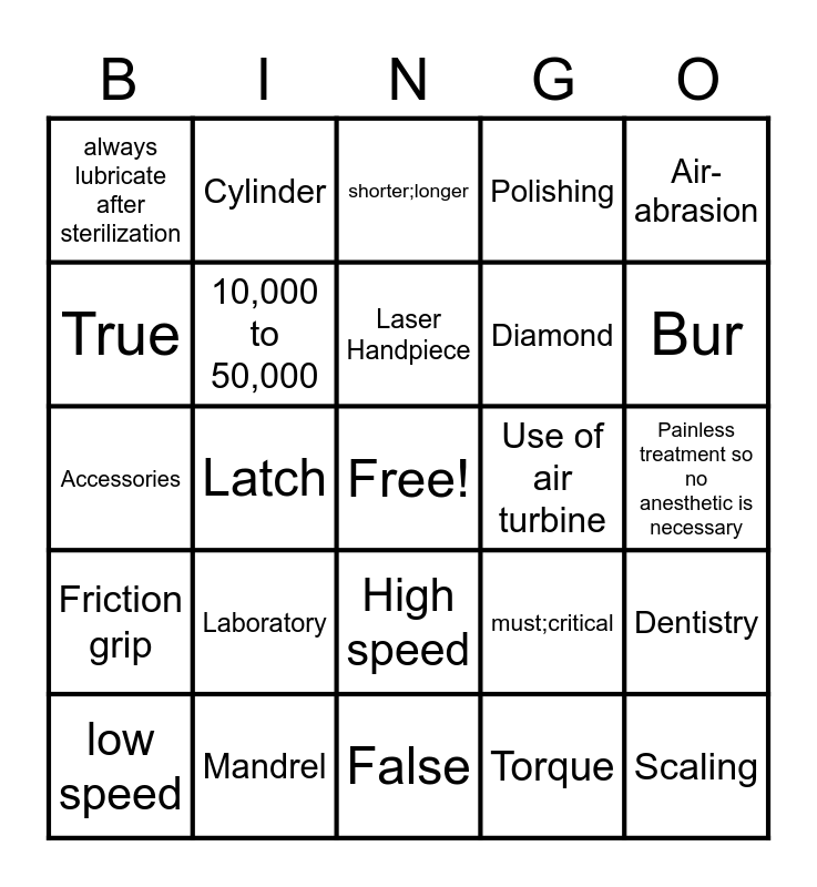 This bingo card has a free space and 39 words: Dental Handpiece, Amalgamator, 10,000 to 40,000, 10,000 to 50,000, low speed, High speed, Laser Handpiece, Ultrasonic, Air-abrasion, Friction grip, Latch, Polishing, Scaling, Painless treatment so no anesthetic is necessary, Use of air turbine, Laboratory, Follow manufacturer instructions, always lubricate after sterilization, semicritical;must, must;critical, True, False, Diamond, Bur, Palladium, Tungsten Carbide, Round, Tapered Fissure, Flame, Cylinder, Abrasive rotary instruments, longer;larger, shorter;longer, Mandrel, Torque, Smile, Dentistry, Accessories and November.