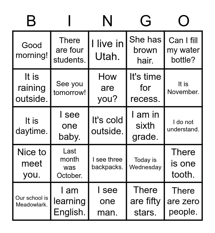 This bingo card has 25 words: Last month was October., I see one man., How are you?, Our school is Meadowlark., Can I fill my water bottle?, Good morning!, It is raining outside., There are four students., I am in sixth grade., I see three backpacks., It's time for recess., It is daytime., Today is Wednesday, There is one tooth., See you tomorrow!, There are zero people., I do not understand., I live in Utah., It is November., I see one baby., It's cold outside., I am learning English., Nice to meet you., She has brown hair. and There are fifty stars..