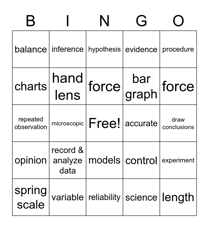 This bingo card has a free space and 24 words: record & analyze data, variable, force, spring scale, procedure, balance, charts, inference, accurate, models, bar graph, repeated observation, control, experiment, hand lens, science, draw conclusions, hypothesis, force, microscopic, length, opinion, evidence and reliability.